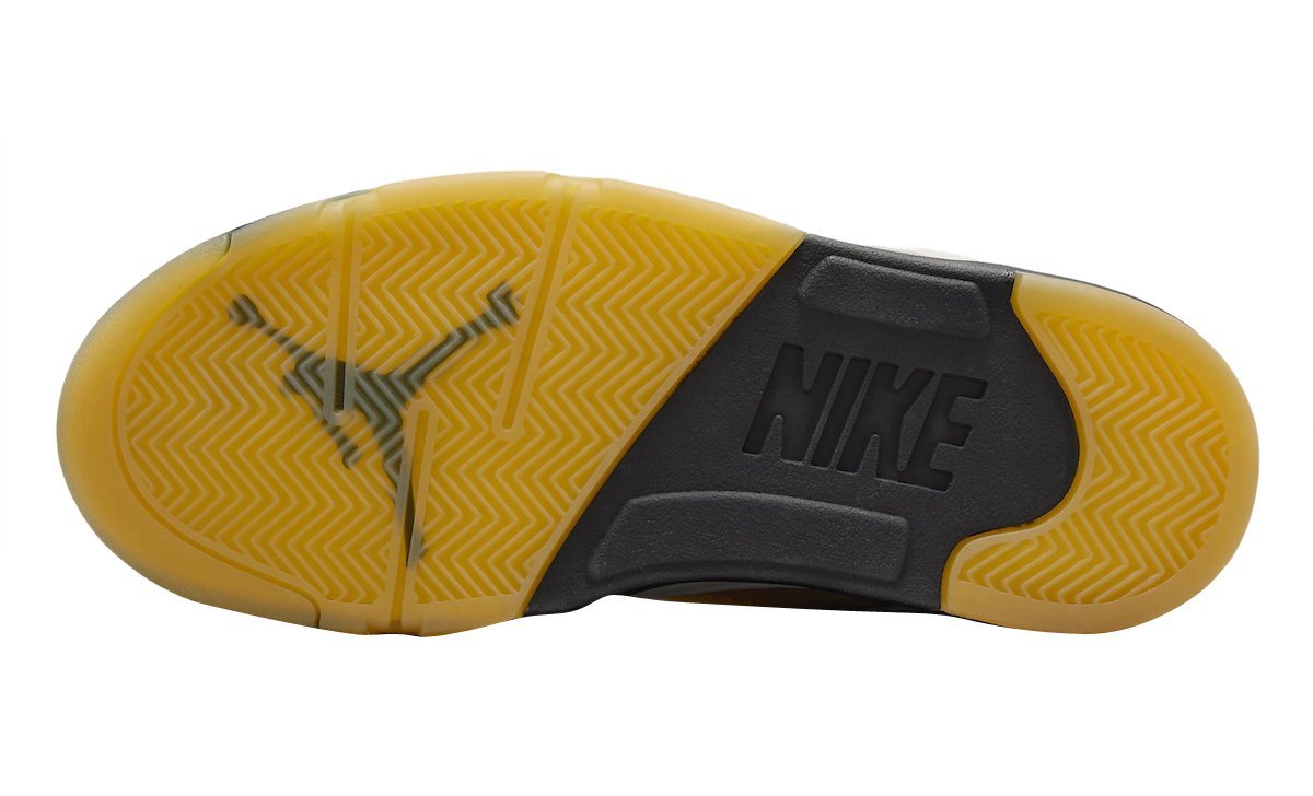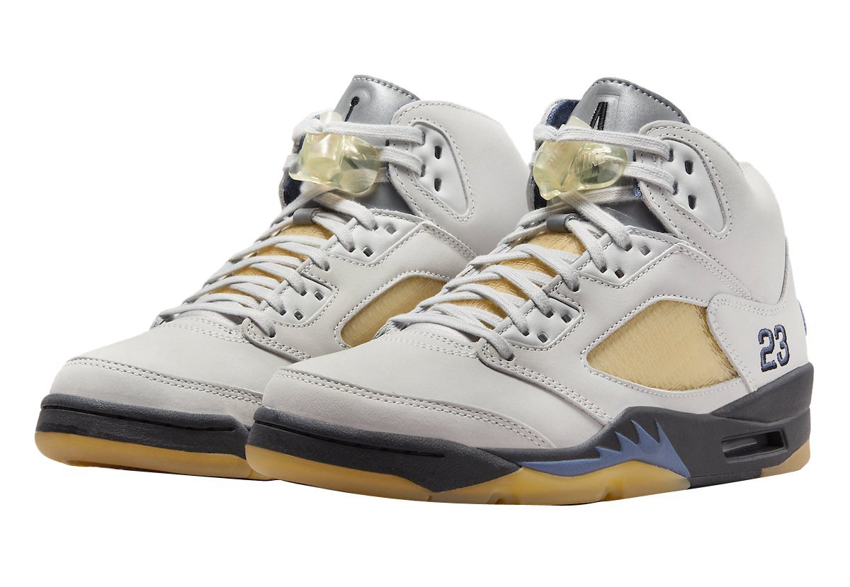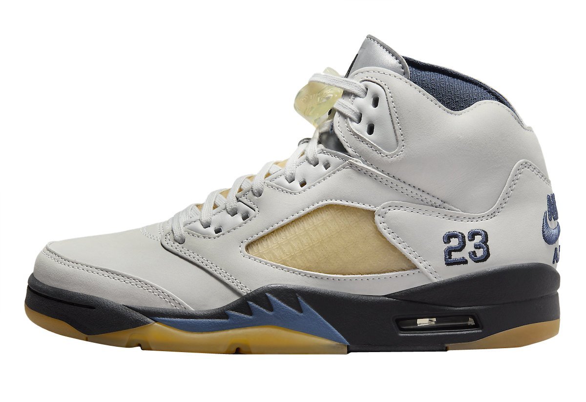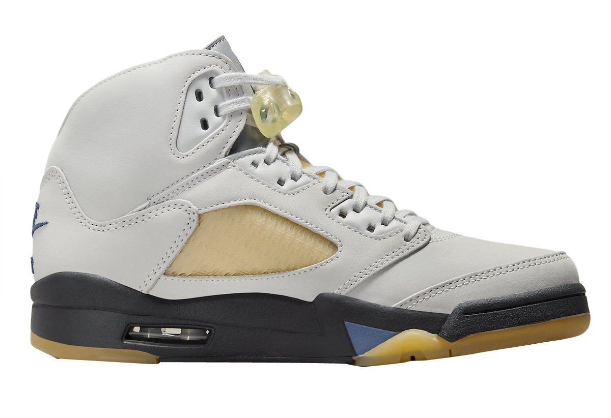 The Air Jordan 5 is given a Photon Dust upper with contrasting Diffused Blue accents. Elsewhere you will find co-branding on the tongue labels and an aged semi-translucent outsole that matches the aesthetics of the side and tongue netting.