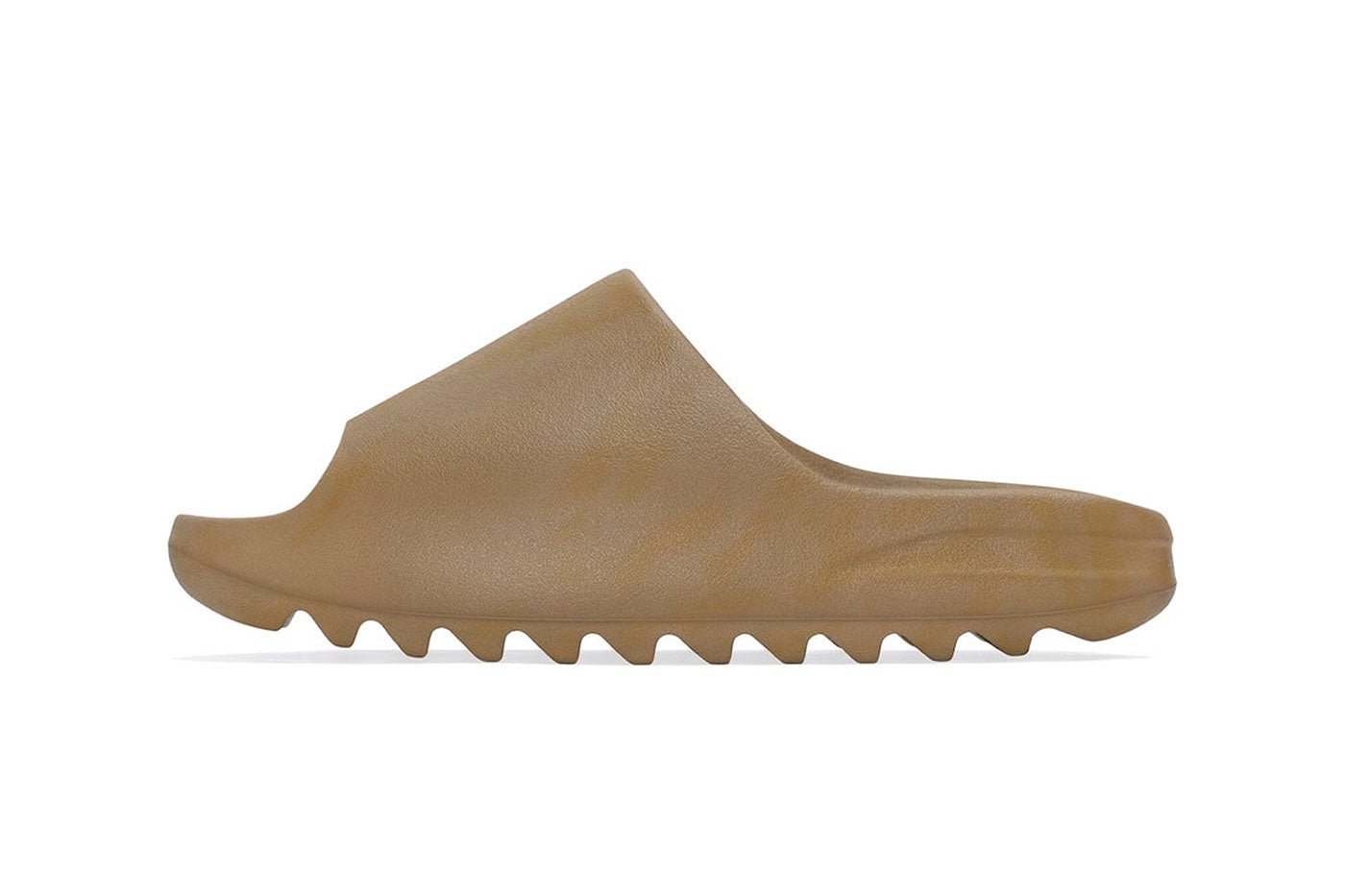 The adidas Yeezy Slide ‘Ochre’ features a rubberized foam build in a lightly textured finish. The diffuse brown palette is marked with subtly discolored patches for an aged aesthetic.