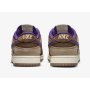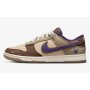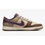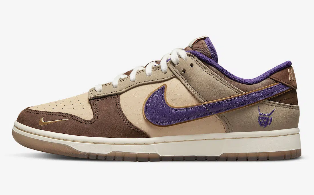 A subtle cracked texture is applied to the beige leather upper, fortified with suede overlays in brown and tan. Contrasting purple accents settle on the collar lining and Swoosh, as well as an embroidered demon graphic on the lateral heel.