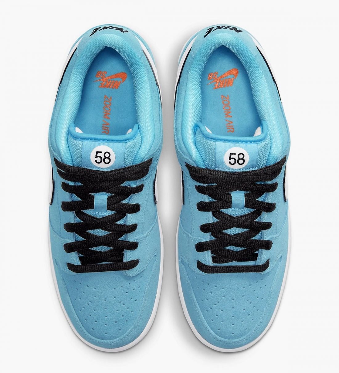 Light blue suede is utilized throughout the upper, accented with a white leather Swoosh and a circular 58 graphic on the lateral heel. The digits are repeated on the woven tag affixed to the stuffed mesh tongue. Underfoot, a bright orange rubber outsole delivers a contrasting pop of color.