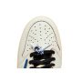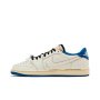 A vintage off-white finish is applied to the textured midsole, supported underfoot by a grippy blue rubber outsole.