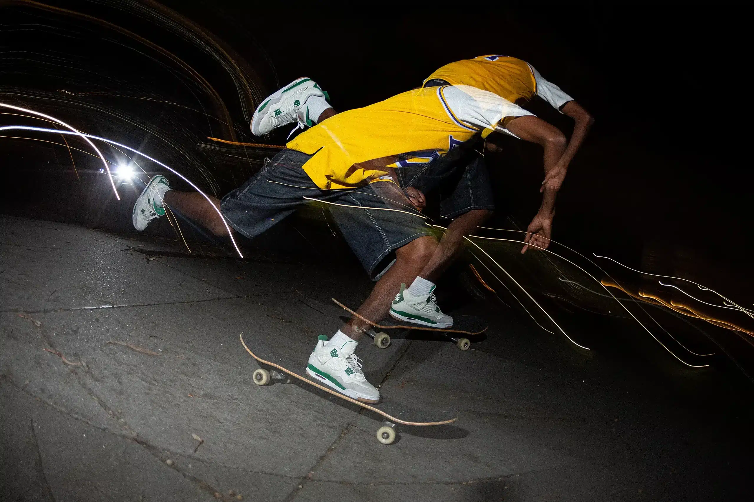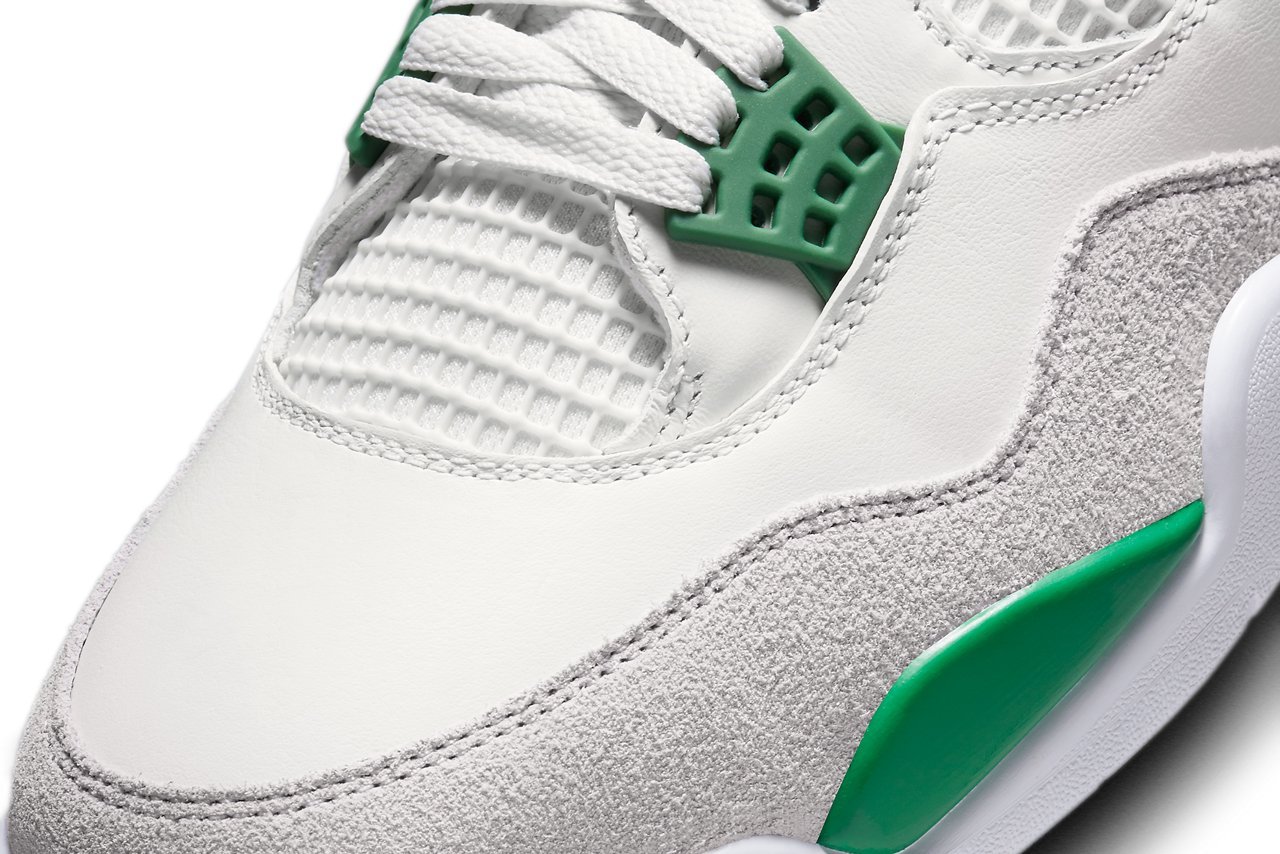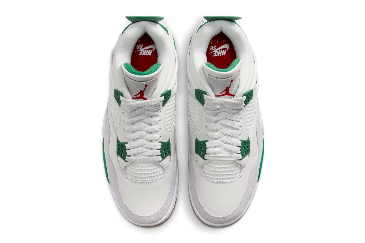 The Nike SB x Air Jordan 4 Retro SP ‘Pine Green’ presents a skate-ready version of the legacy silhouette. Crafted from smooth off-white leather, the upper is reinforced with a forefoot overlay in light grey suede. Contrasting green accents land on the molded eyelets and heel tab, the latter marked with embossed Nike SB branding. A crimson Jumpman on the Flight tongue tag provides an unexpected pop of color. The sneaker rides on a two-tone foam midsole, fitted with an exposed Air-sole unit in the heel and supported by a gum rubber outsole.