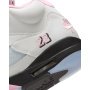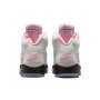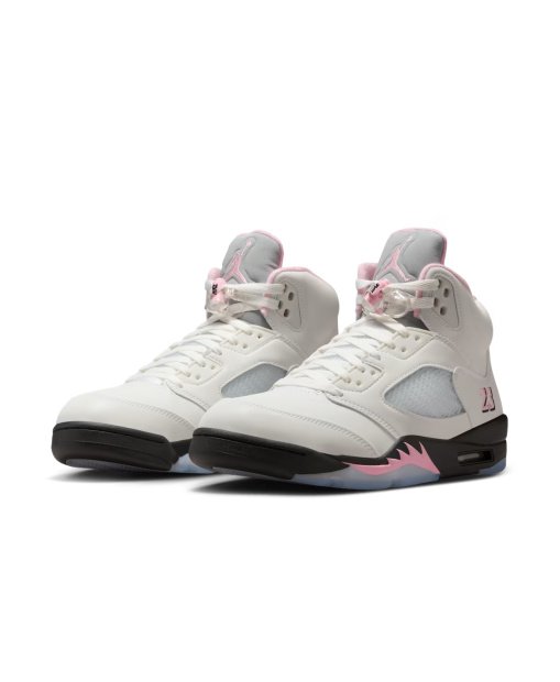 The Air Jordan 5 Retro ‘Medium Soft Pink’ showcases a white leather upper that is treated to a 3M finish, featuring translucent quarter panel netting and a pink embroidered ’23’ on the lateral heel.