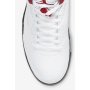 The white leather upper is accented with quarter panel netting and contrasting black TPU eyelets. A red Jumpman icon stands out against the black tongue, while an embroidered ’23’ adorns the lateral heel.