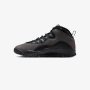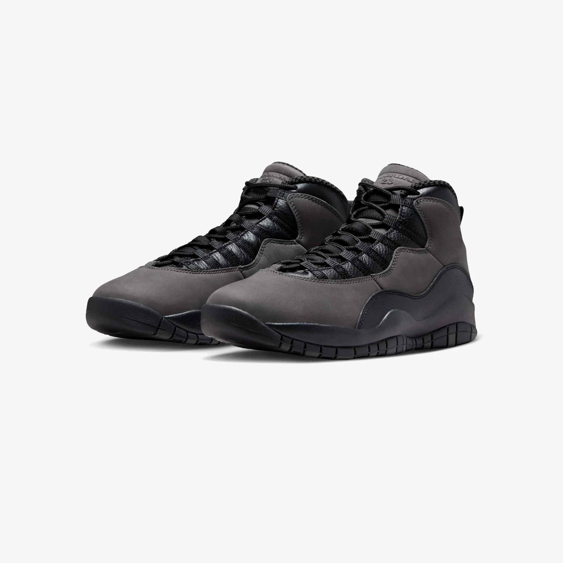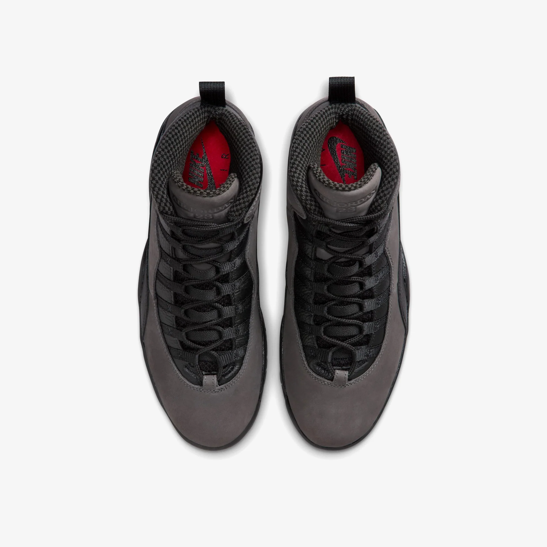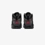 A speed lacing system secures the dark grey nubuck upper, fortified with black tumbled leather on the eyestay and mudguard. Signature details include a crimson Jumpman on the back heel and a padded collar lined in checkerboard textile.