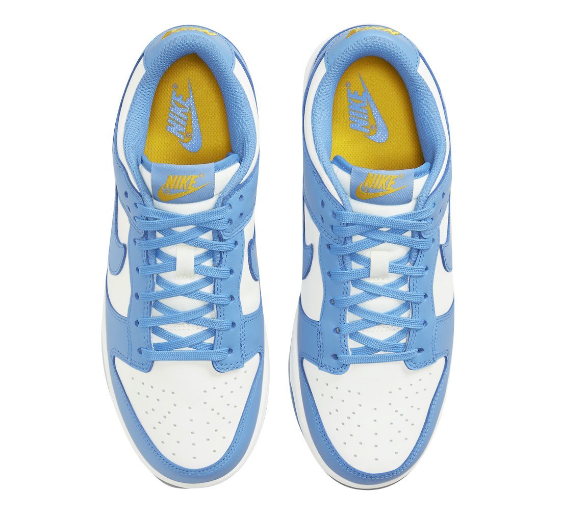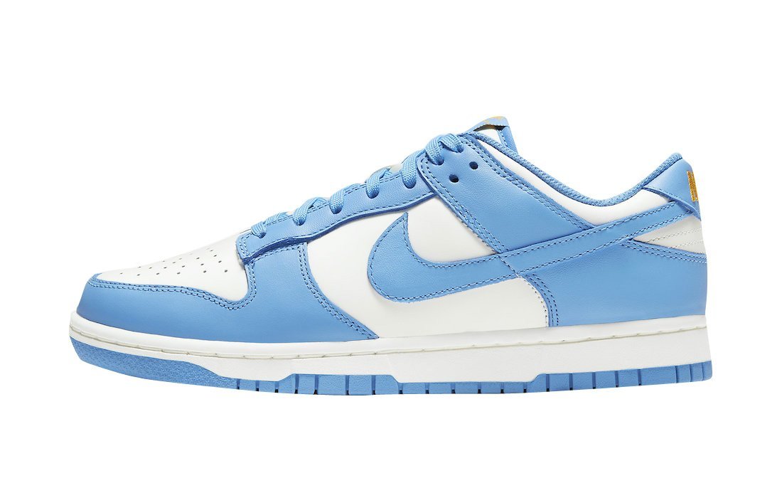 The Nike women’s Dunk Low ‘Coast’ highlights traditional two-tone color blocking on a leather upper that maintains the look of the original 1985 release. A crisp white base, replete with perforated detailing on the toe box, is contrasted by overlays in a vibrant blue finish. Nike branding on the heel tab and woven tongue tag are rendered in an unexpected pop of yellow. The sneaker rides on a low-profile midsole, supported by a rubber outsole featuring concentric circle tread.