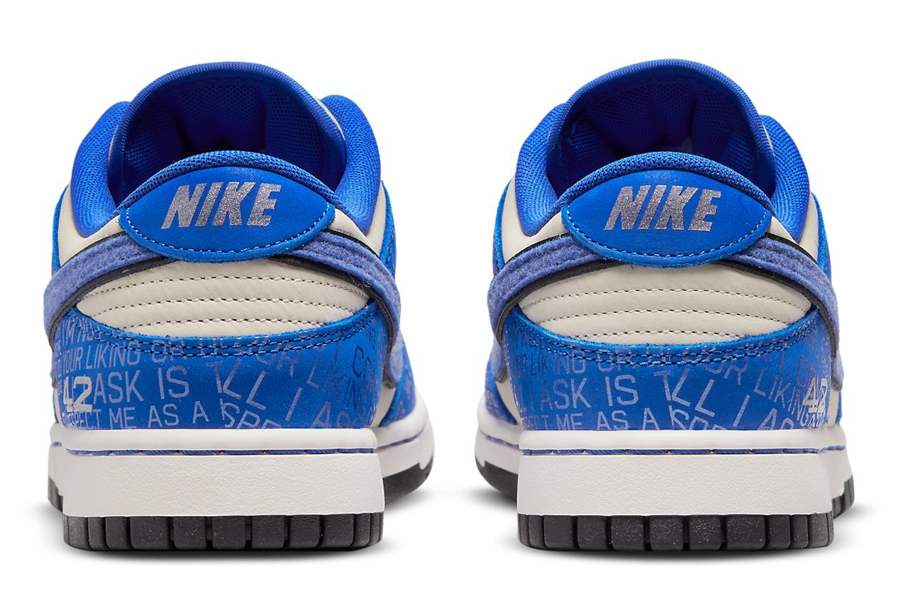 The Nike Dunk Low ‘Jackie Robinson’ celebrates the 75th anniversary of an epochal sports moment. On April 15, 1947, Jackie Robinson broke baseball’s color barrier by making his major league debut with the Brooklyn Dodgers. The team’s colors are represented by the shoe’s leather upper, featuring an off-white base with royal blue overlays. The latter is inscribed with Jackie’s inspirational quotes, while the athlete’s jersey number is stamped on the lateral heel. Additional unique details include stitched laces, felt Swooshes, and a 75th anniversary tongue tag.