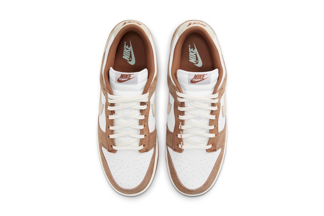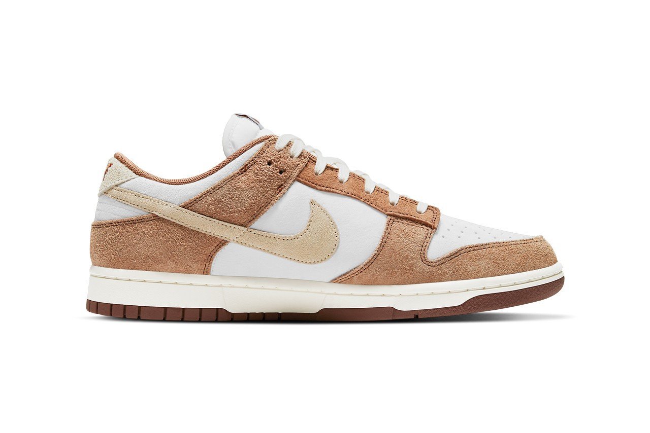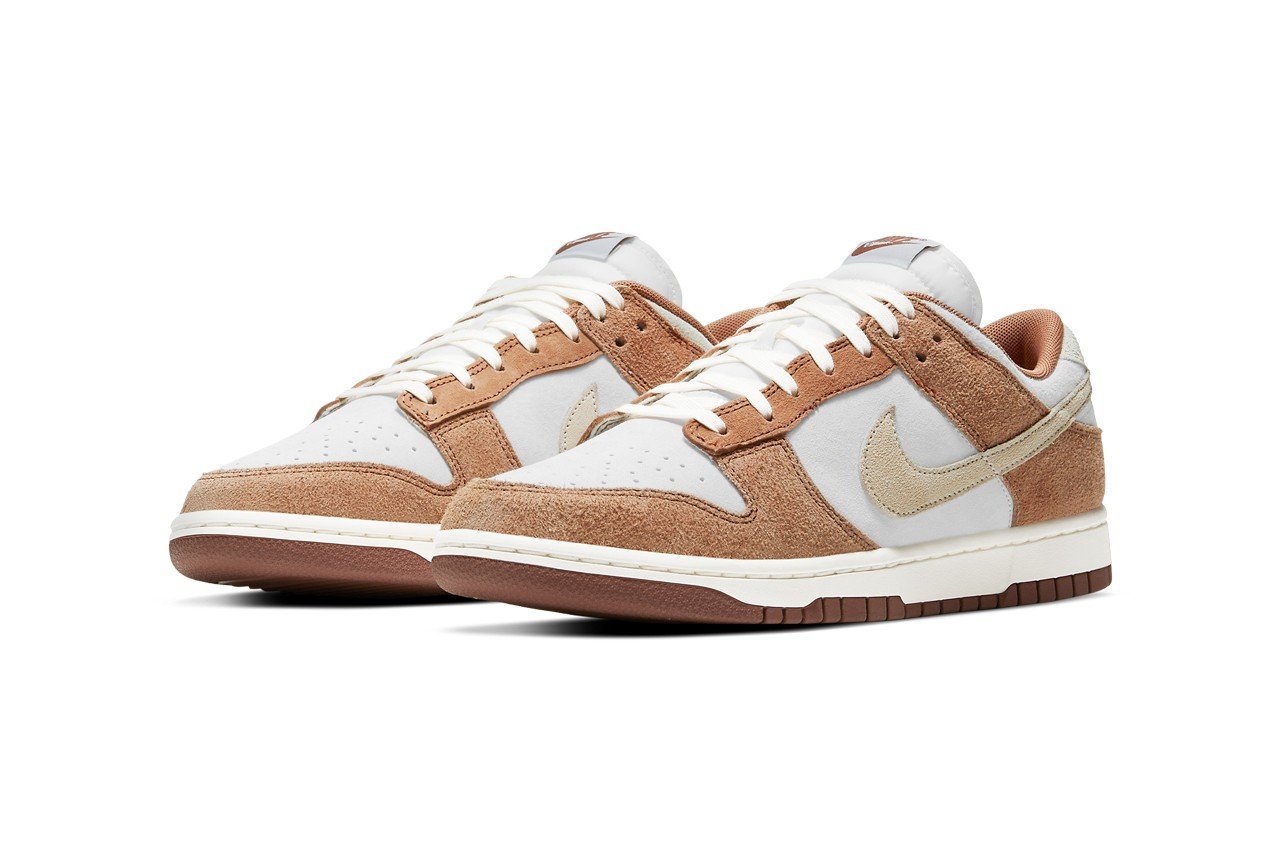 The Nike Dunk Low Premium ‘Medium Curry’ dresses the retro silhouette in a suede upper finished in warm, autumnal hues. A cream-hued base is contrasted by curry brown overlays at the toe and heel, while Fossil coloring is applied to the Swoosh and heel tab, the latter marked with traditional Nike branding. The low-top rides on a durable rubber cupsole, featuring a grippy traction pattern virtually identical to another mid ‘80s hoops shoe, the Air Jordan 1.