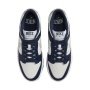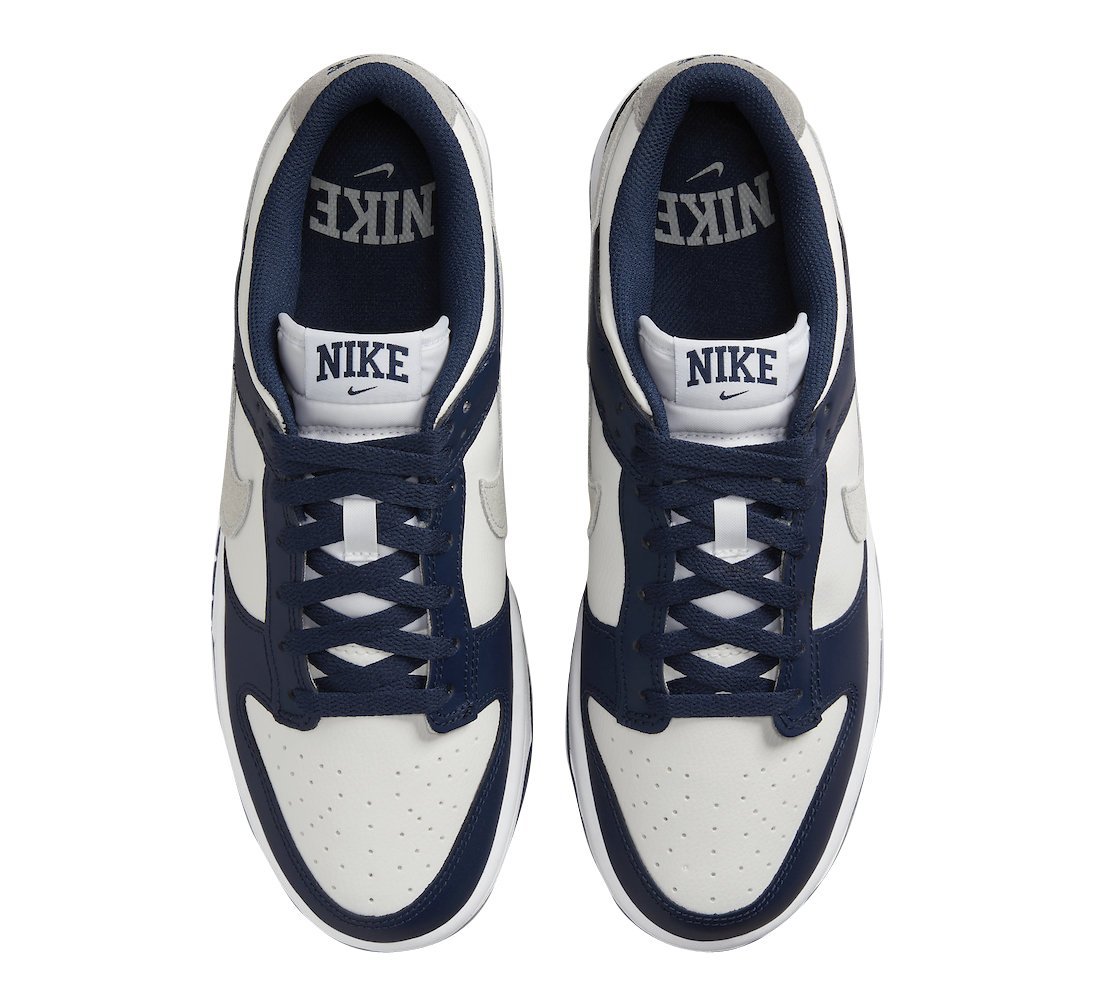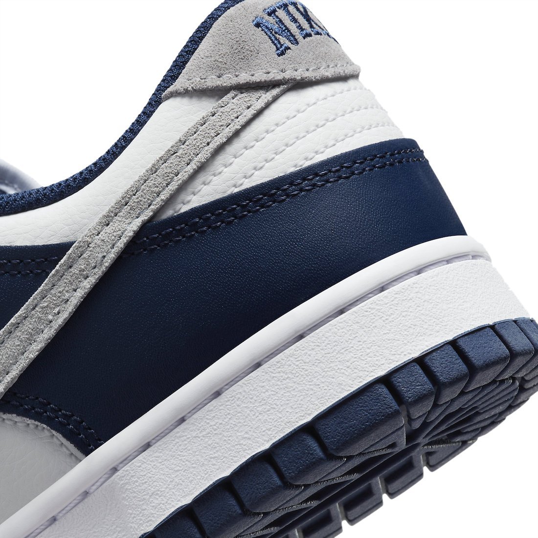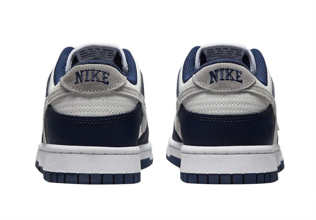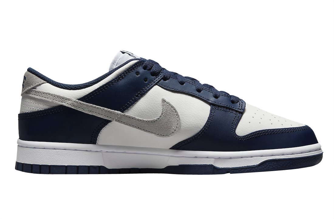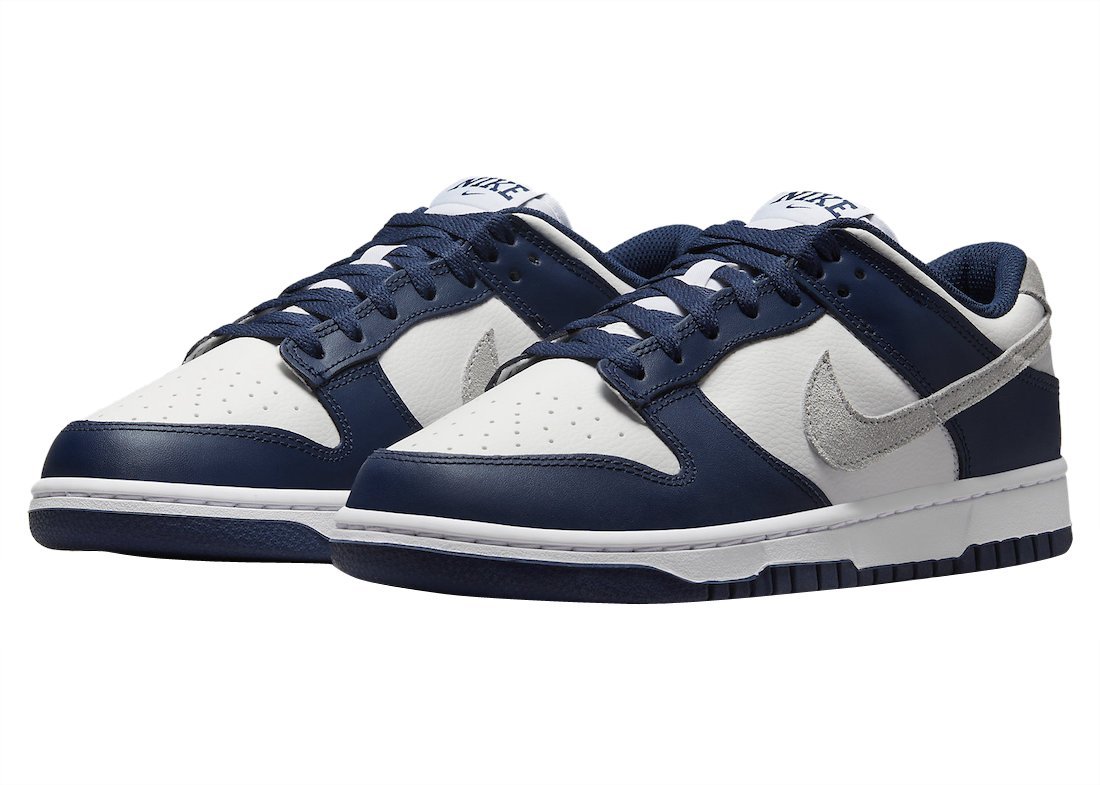 Taking on an official color combination of Midnight Navy/White-Neutral Grey, this Nike Dunk Low starts off with a White/Sail tumbled leather construction on the base of the upper which is then joined by Midnight Navy on the leather overlays, laces, inner liner, rubber outsoles, and the new Nike branding on the tongues. As a finishing touch we see grey suede Swooshes on the side panels and a white rubber midsole.