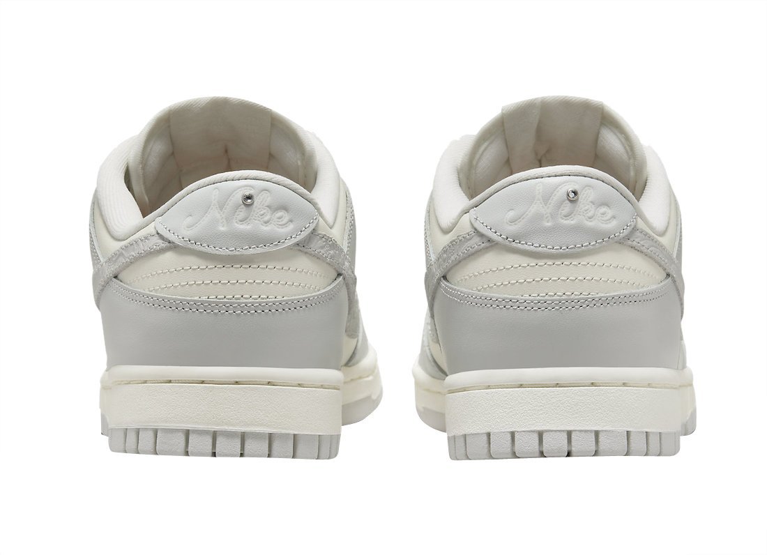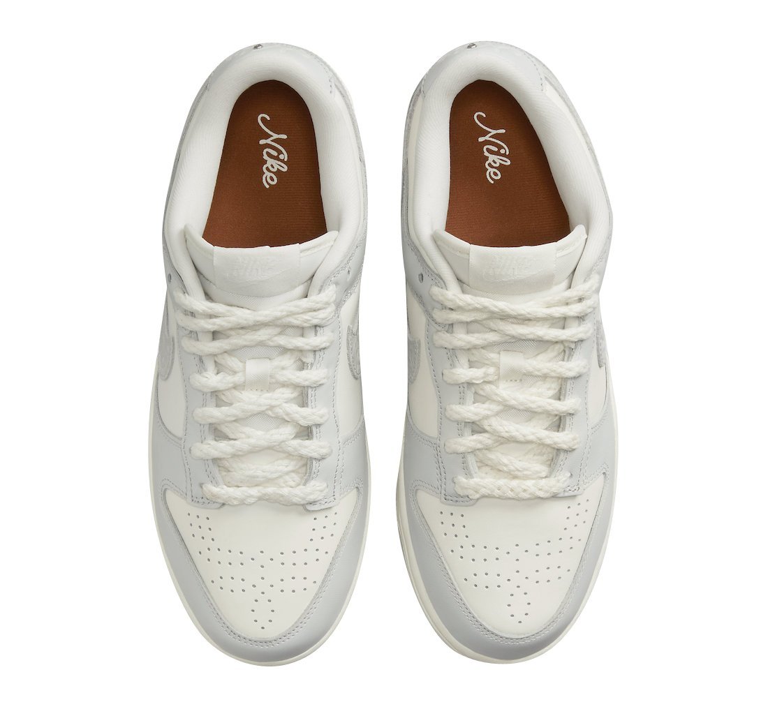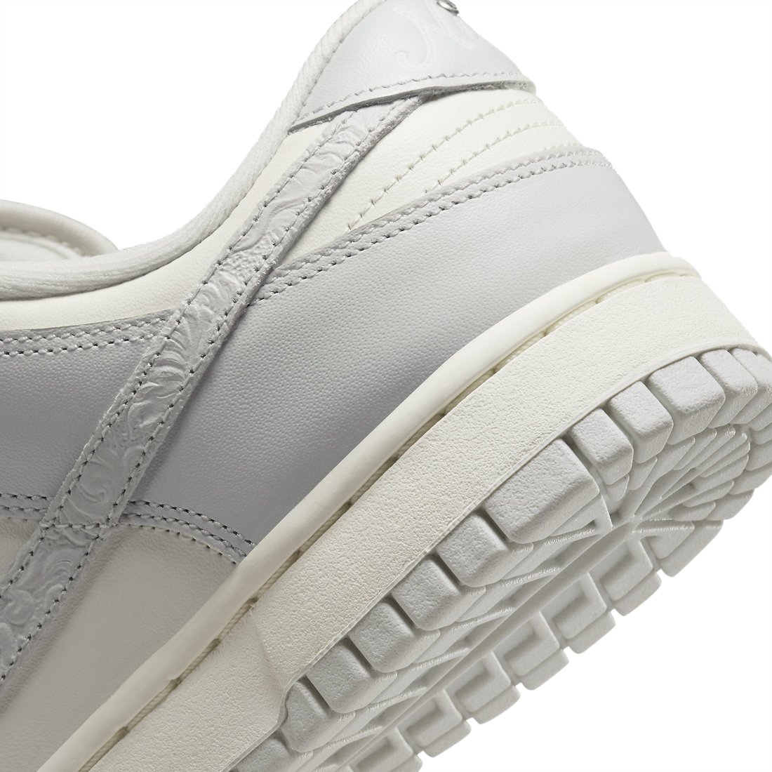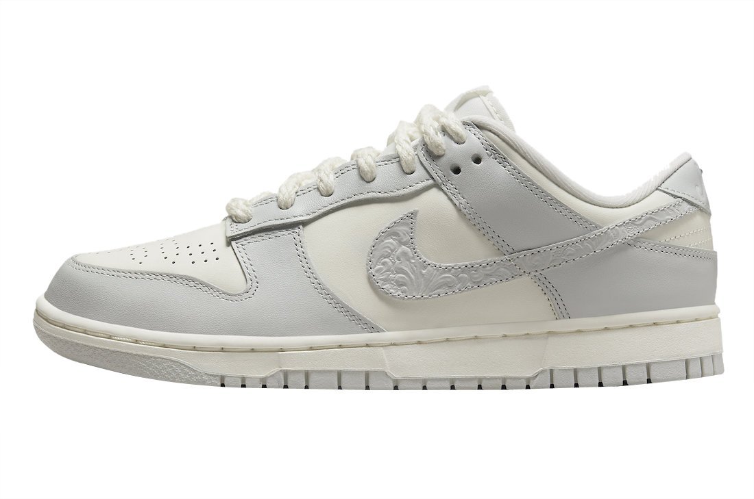 The Needlework Sail Aura Nike Dunk Low has an upper constructed entirely of leather with ship-seated overlays and multi-row stitching. The shoe has a lacing system for an adjustable fit and a cushioned tongue for support. The midsole of the shoe is cushioned with EVA foam for lightweight, responsive cushioning and support. The durable rubber outsole of the shoe provides grip and durability. The shoe features a perforated toe box for breathability. The shoe’s design is completed with a Nike Swoosh on either side and Nike branding on the heel.