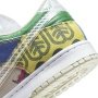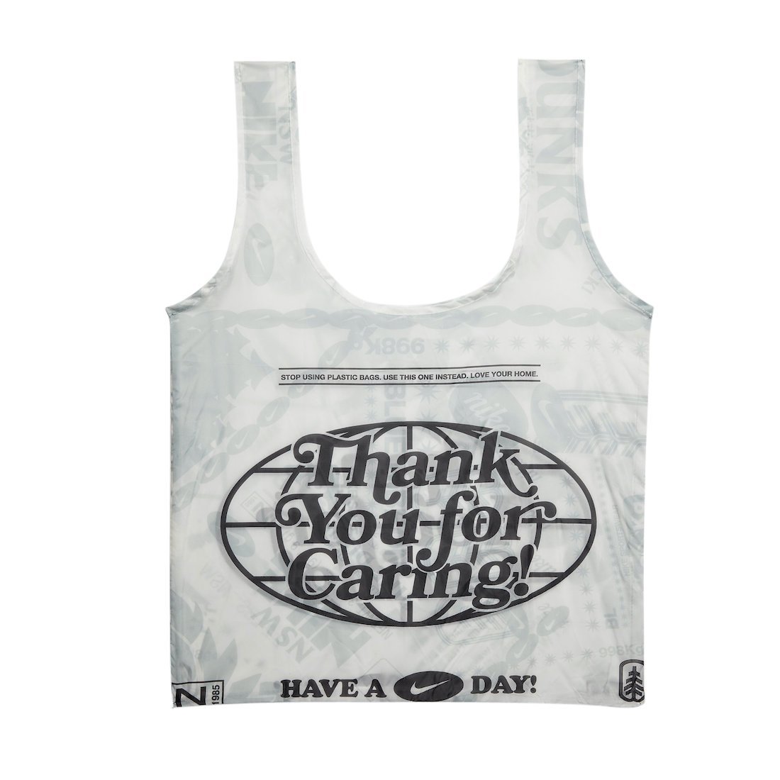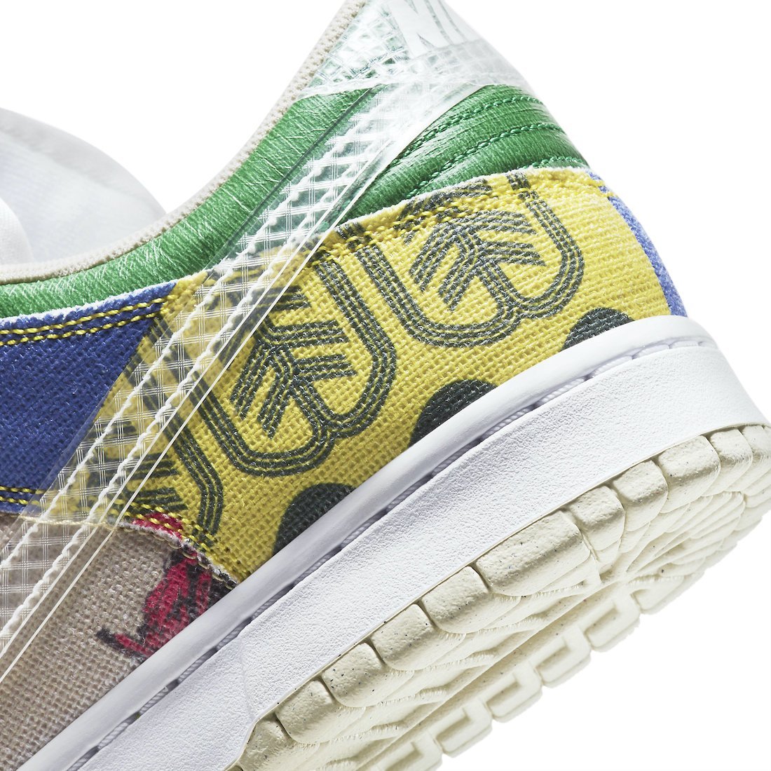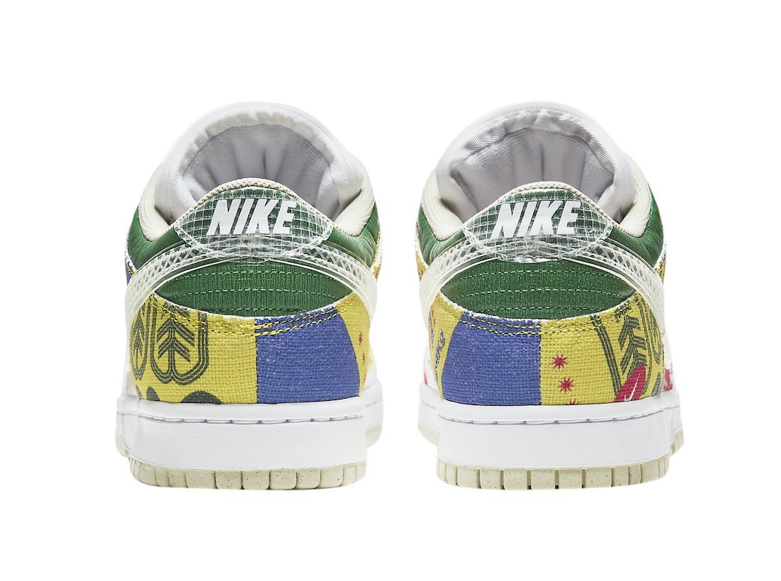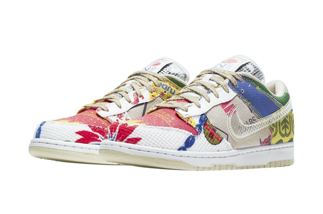The Nike Dunk Low SP City Market is composed of a variety of up-cycled materials. Each panel is constructed of a different canvas material, similar to the variety of bags one would see when passing by local vendors at a street market. The tongue contains a small, zippered compartment that is big enough to store a folded, reusable shopping bag – or anything worth keeping in a small bag. Following the market theme, the tongue label resembles the nutrition labels found on food packaging. Other details include a “Thank You For Caring” print on the insole, rope laces, and a white and beige sole.