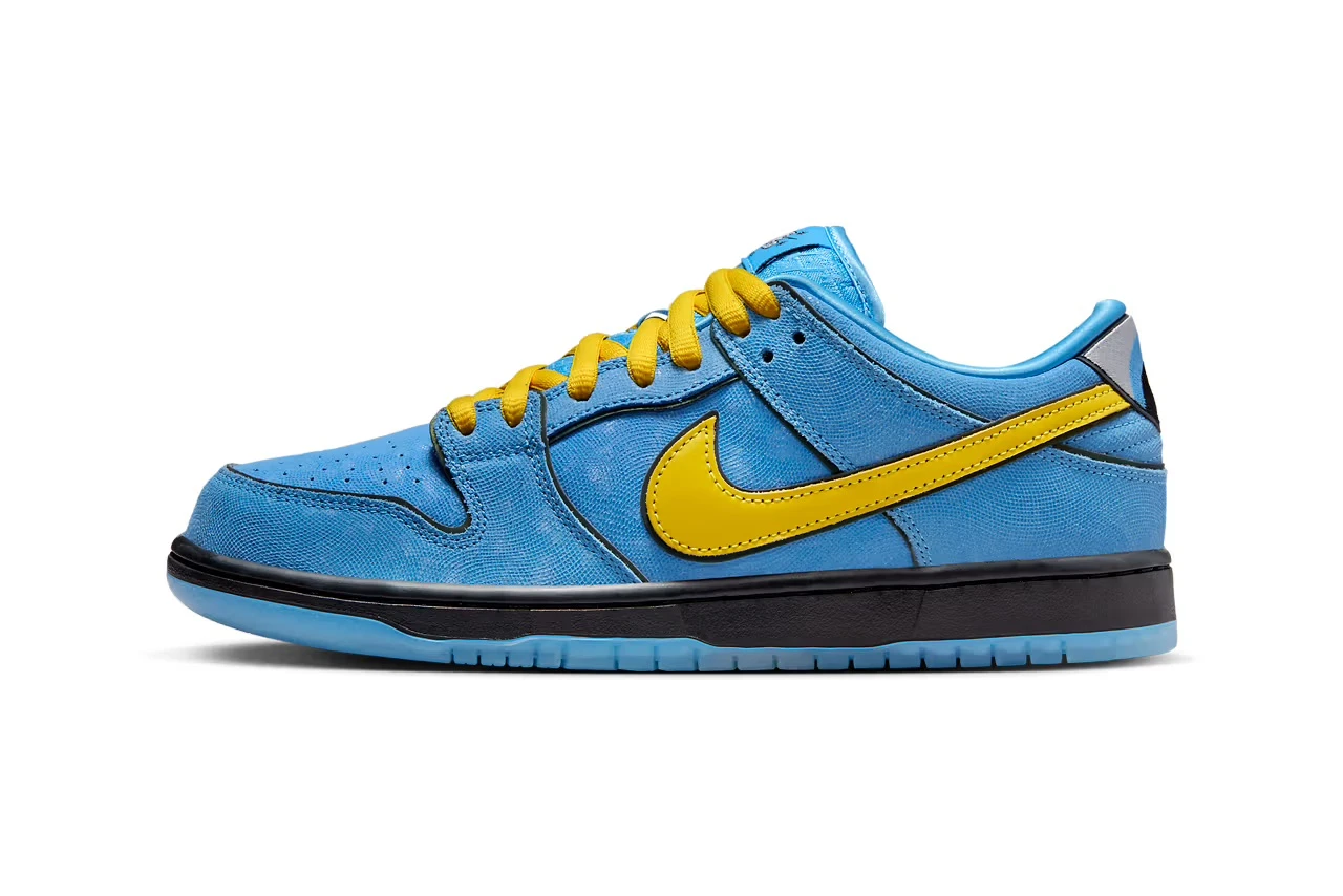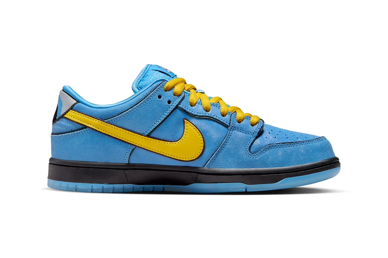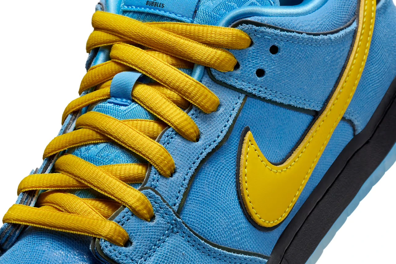 Taken from a footwear collection inspired by the animated television series, the Powerpuff Girls x Nike Dunk Low Pro SB QS ‘Bubbles’ features a textured blue leather upper, lined in shiny satin and accented with black piping and a contrasting yellow Swoosh.