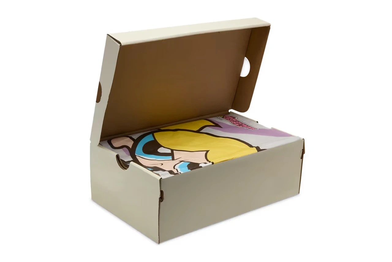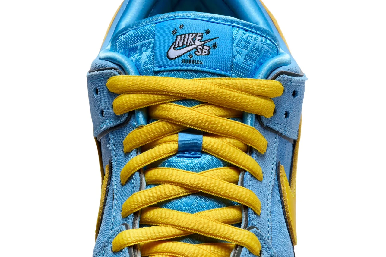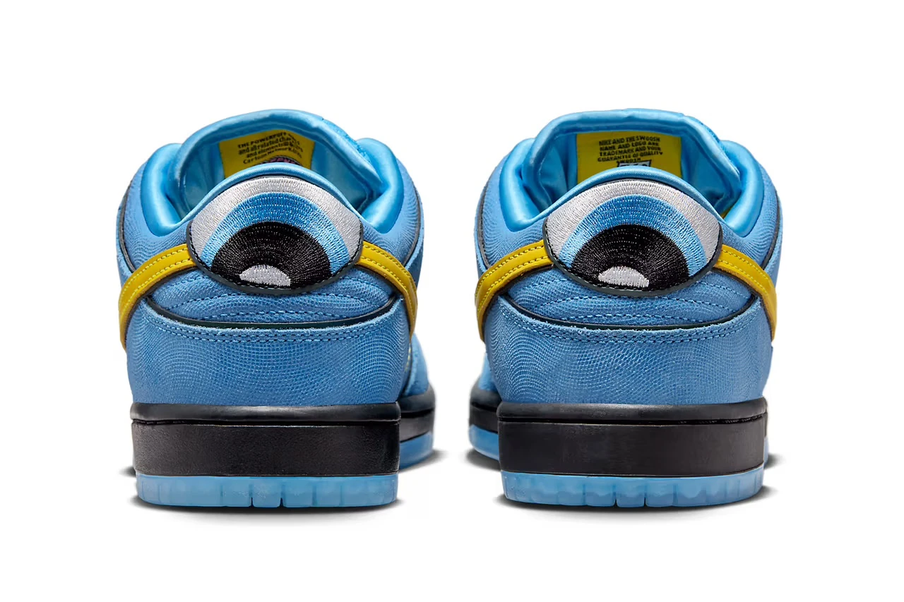 Taken from a footwear collection inspired by the animated television series, the Powerpuff Girls x Nike Dunk Low Pro SB QS ‘Bubbles’ features a textured blue leather upper, lined in shiny satin and accented with black piping and a contrasting yellow Swoosh.