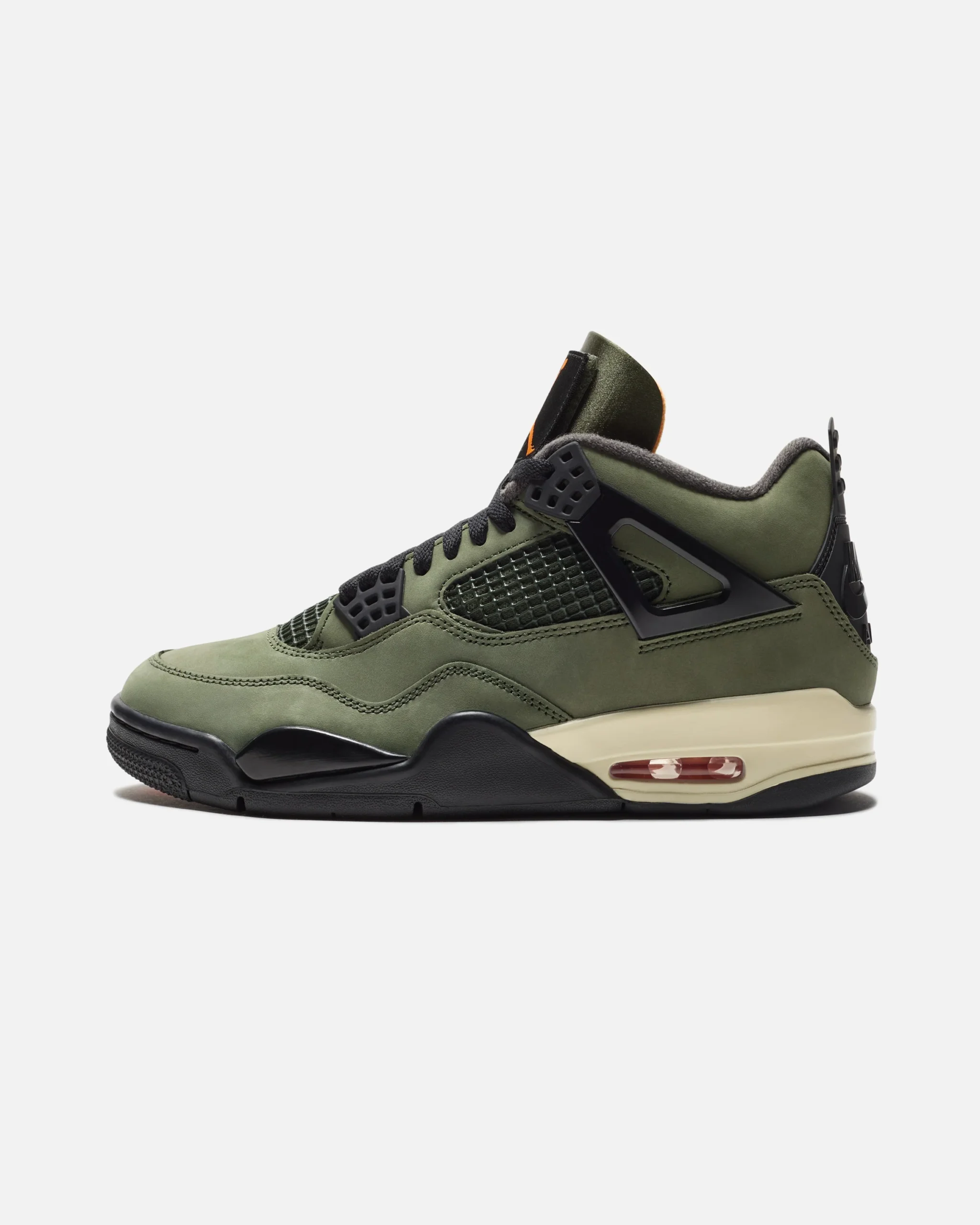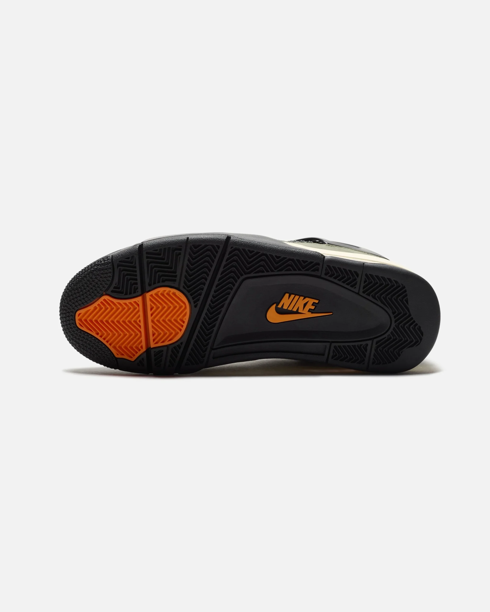The sneaker rests on an off-white polyurethane midsole with a visible orange-tinged Air unit in the heel.
